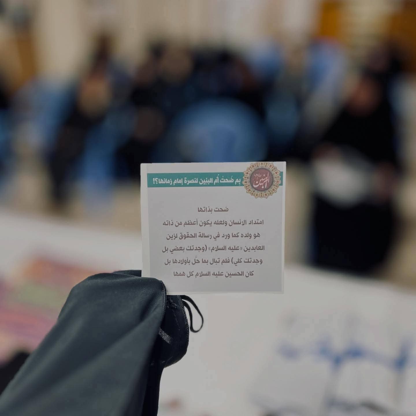 كما أُقيمت ورشة بعنوان: “بين الواجب والقدوة… رحلة أم البنين في حياتنا اليوم” سلطت الضوء على القيم التربوية والأخلاقية التي تمثلها سيدة الوفاء، وكيفية استلهامها في الواقع المعاصر.